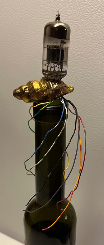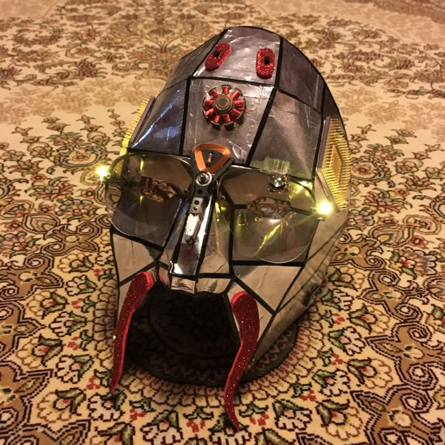 Drew my face as a polyhedral model. Covered with aluminum tape. Emphasized with black pin striping. Lined with peel-n-stick black felt. Earpieces of glasses hold it on. Added bits and bobs (LEDs, batteries, switches, stator winding, CPU, etm).